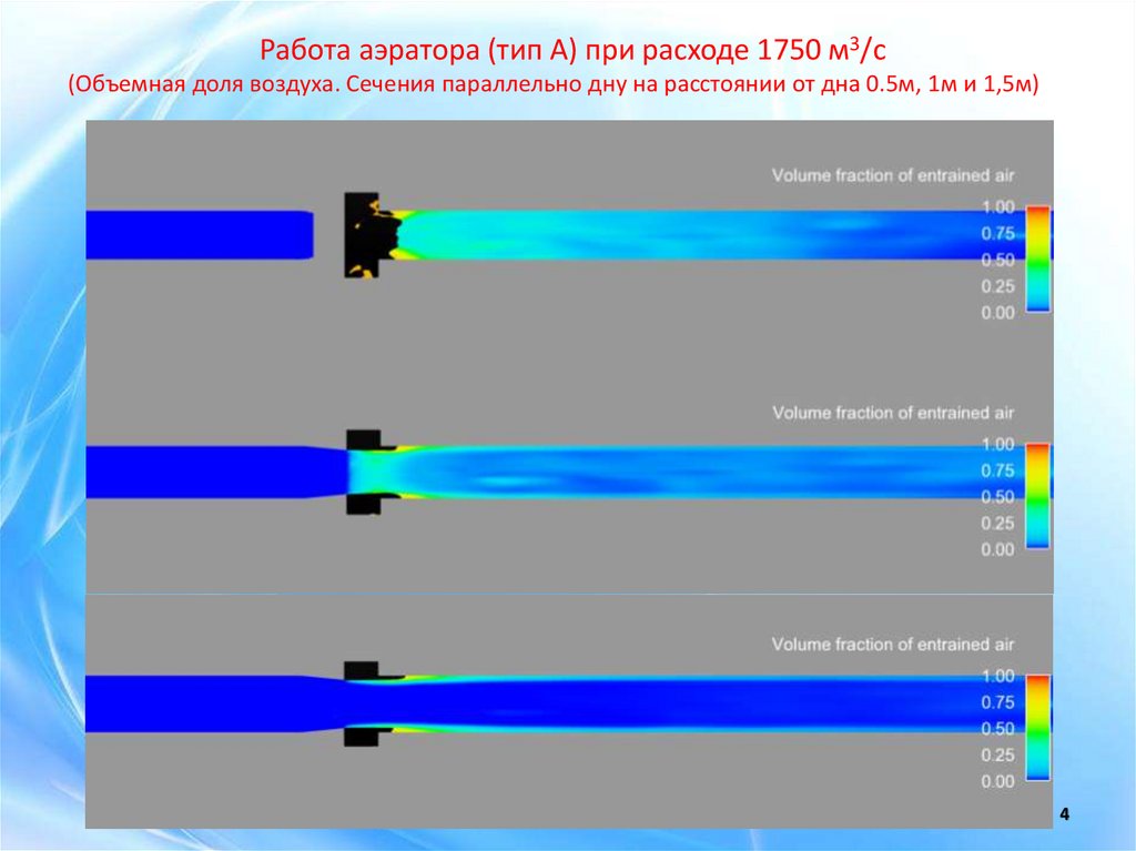 Работа аэратора (тип А) при расходе 1750 м3/с(Объемная доля воздуха. Сечения параллельно дну на расстоянии от дна 0.5м, 1м и 1,5м)