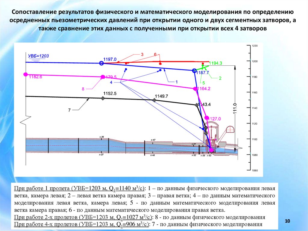 При работе 4-х пролетов (УВБ=1203 м, Q1=906 м3/с): 7 - по данным физического моделирования