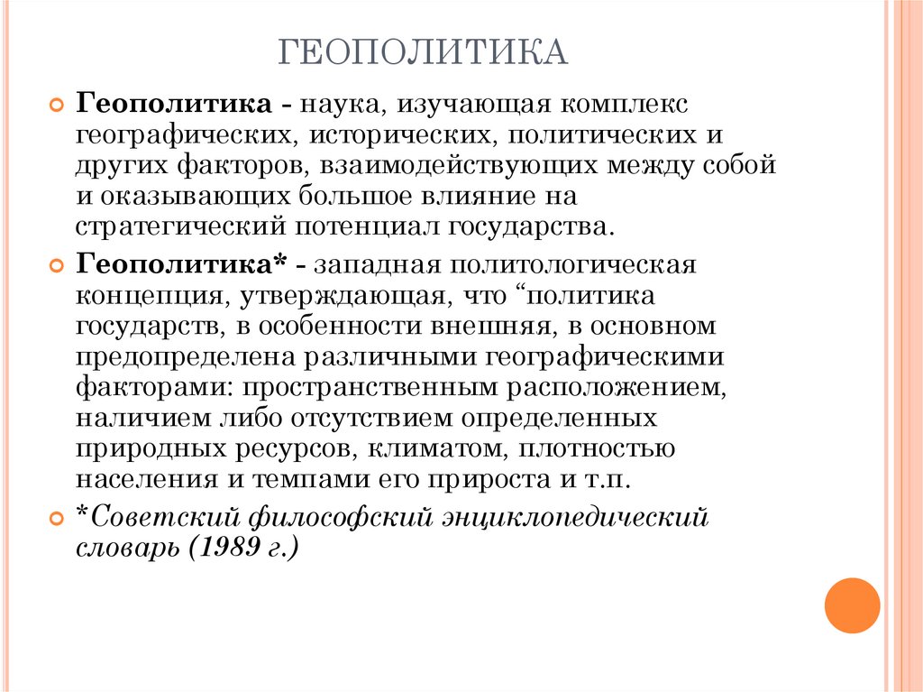 ГЕОПОЛИТИКАГеополитика - наука, изучающая комплекс