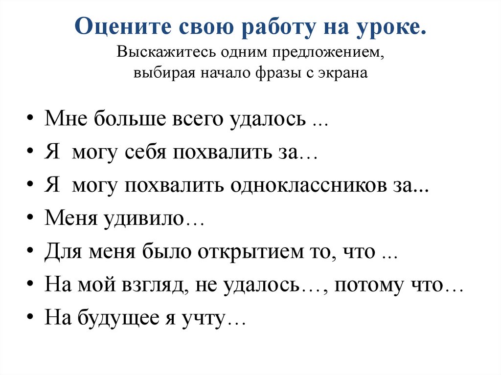 Оцените свою работу на уроке.Выскажитесь одним предложением,