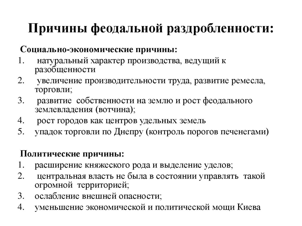 Причины феодальной раздробленности:Социально-экономические причины: