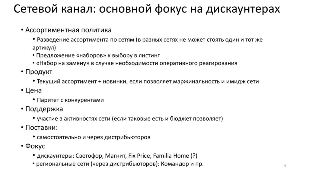 Сетевой канал: основной фокус на дискаунтерах• Ассортиментная политика