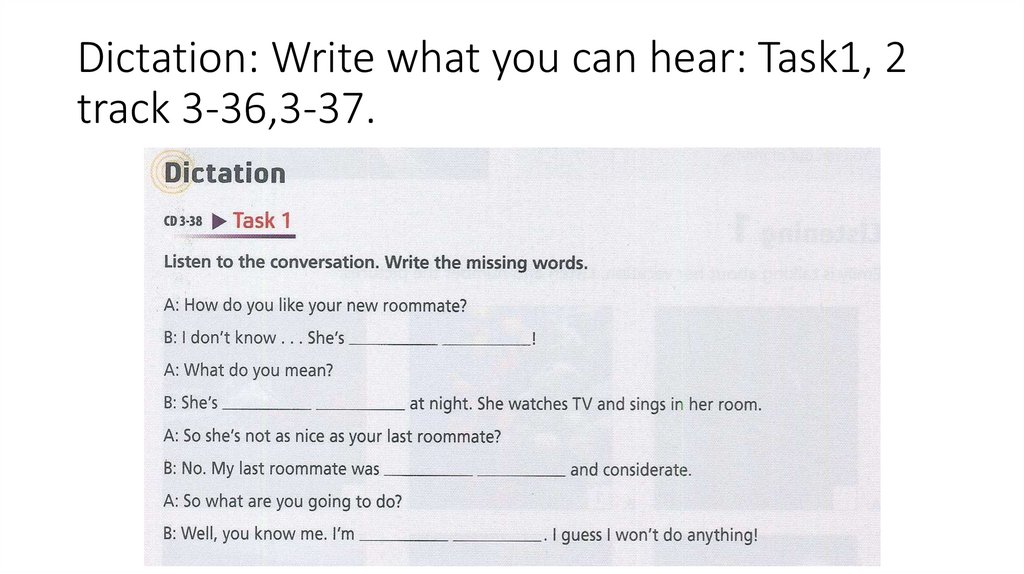 Dictation: Write what you can hear: Task1, 2track 3-36,3-37.
