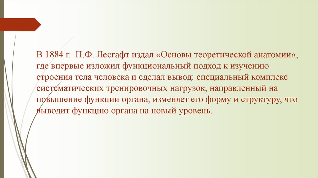 В 1884 г. П.Ф. Лесгафт издал «Основы теоретической анатомии»,где впервые изложил функциональный подход к изучению