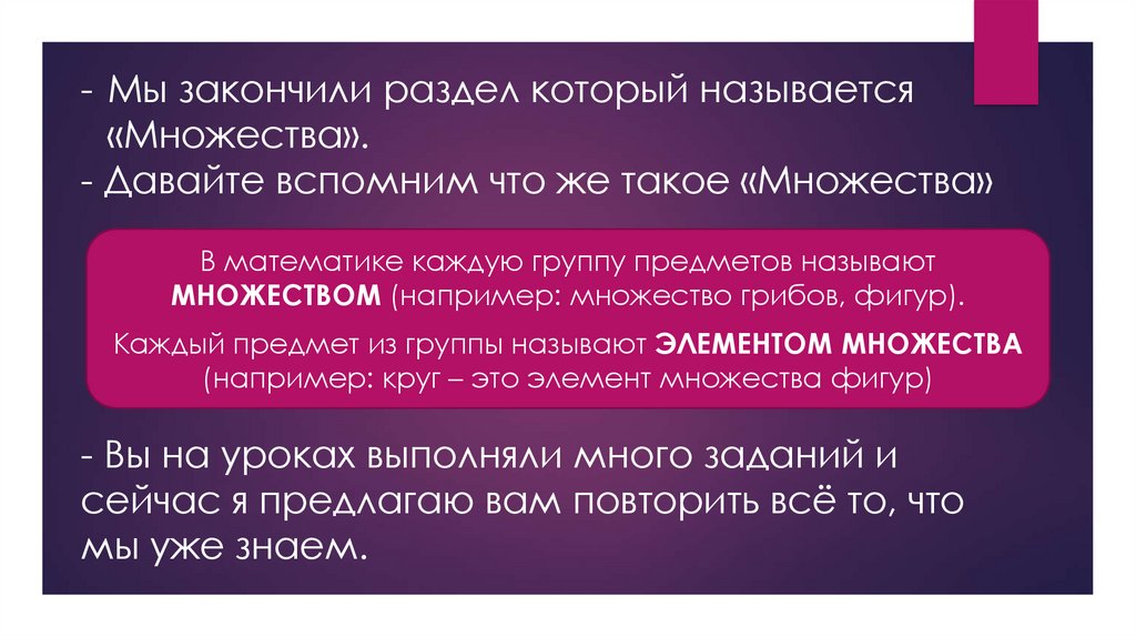 Каждый предмет из группы называют ЭЛЕМЕНТОМ МНОЖЕСТВА