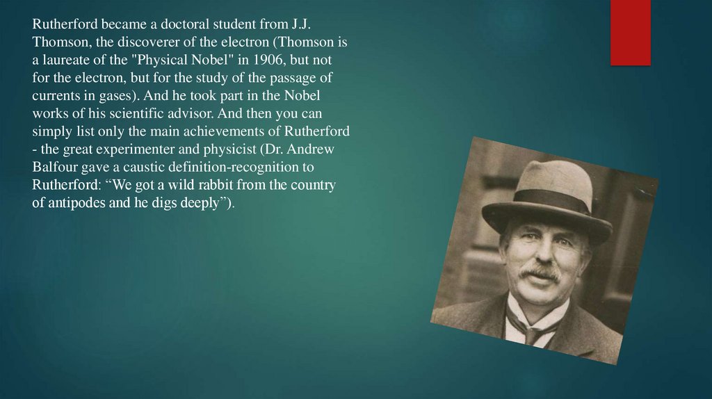 Rutherford became a doctoral student from J.J.Thomson, the discoverer of the electron (Thomson is