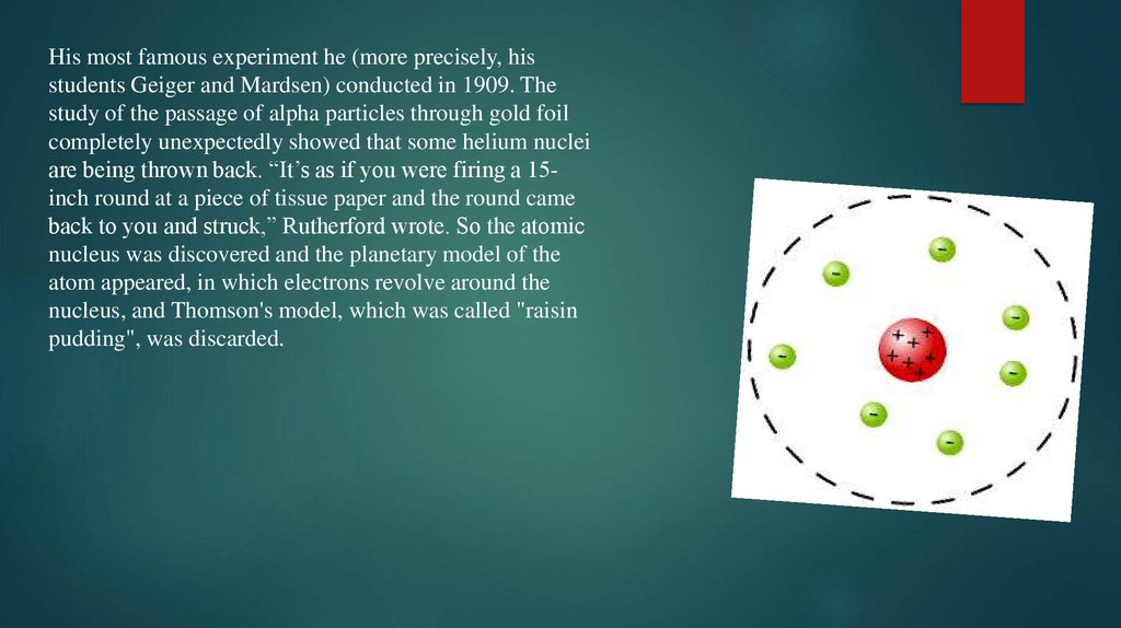 His most famous experiment he (more precisely, hisstudents Geiger and Mardsen) conducted in 1909. The