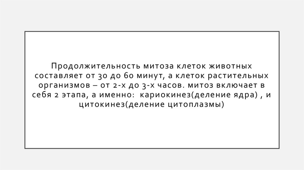 Продолжительность митоза клеток животныхсоставляет от 30 до 60 минут, а клеток растительных