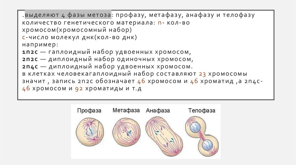 . выделяют 4 фазы метоза: профазу, метафазу, анафазу и телофазуколичество генетического материала: n- кол-во