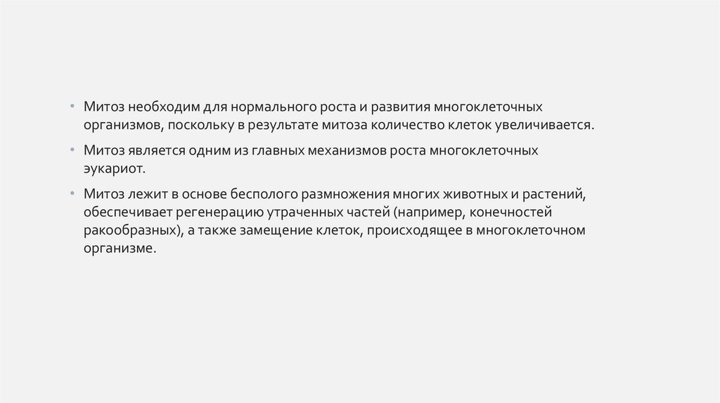 • Митоз необходим для нормального роста и развития многоклеточныхорганизмов, поскольку в результате митоза количество клеток увеличивается.