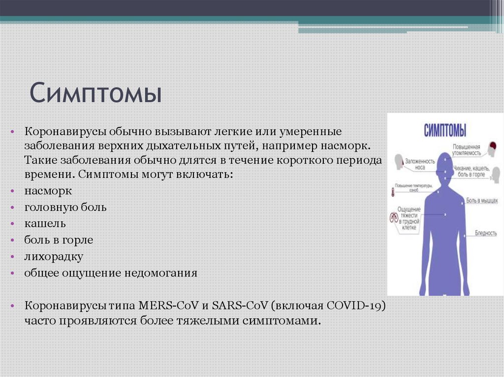 Симптомы• Коронавирусы обычно вызывают легкие или умеренные