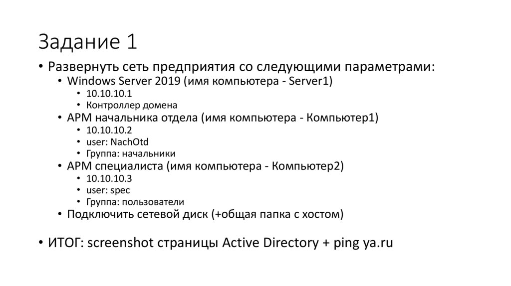 Задание 1• Развернуть сеть предприятия со следующими параметрами: