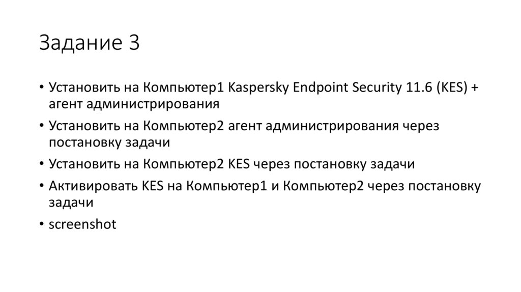 Задание 3• Установить на Компьютер1 Kaspersky Endpoint Security 11.6 (KES) +