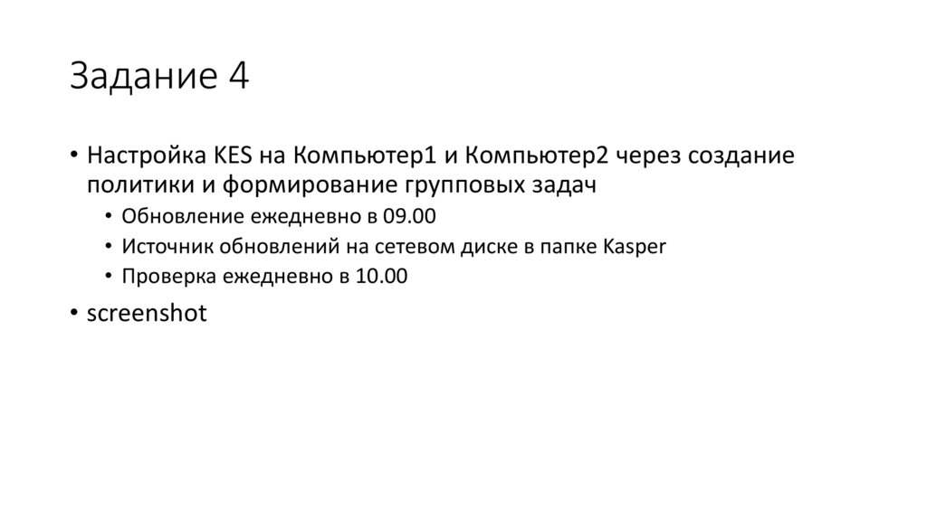 Задание 4• Настройка KES на Компьютер1 и Компьютер2 через создание