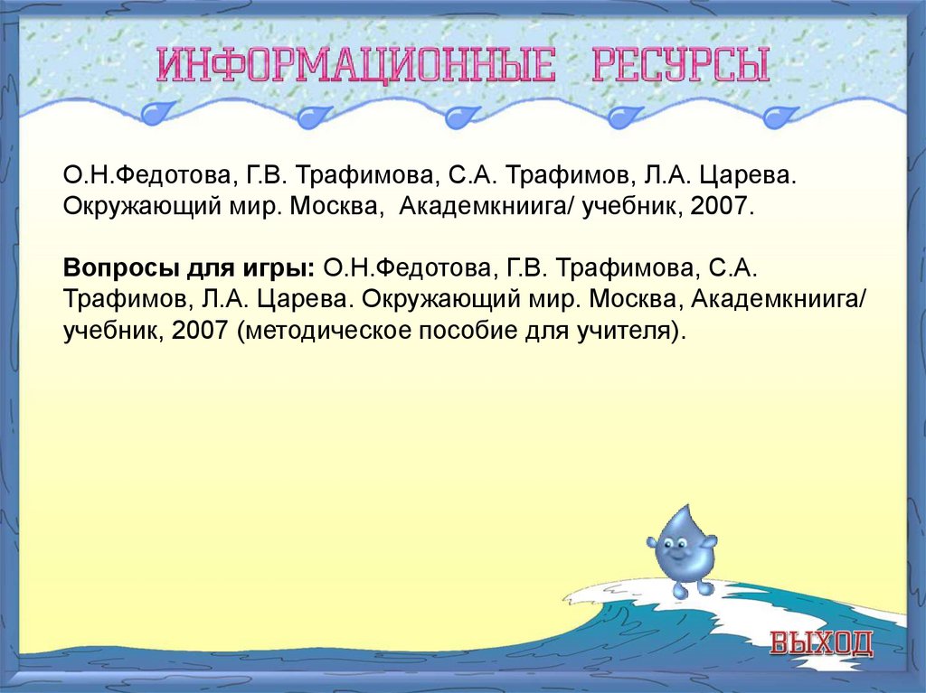 О.Н.Федотова, Г.В. Трафимова, С.А. Трафимов, Л.А. Царева.Окружающий мир. Москва, Академкниига/ учебник, 2007.