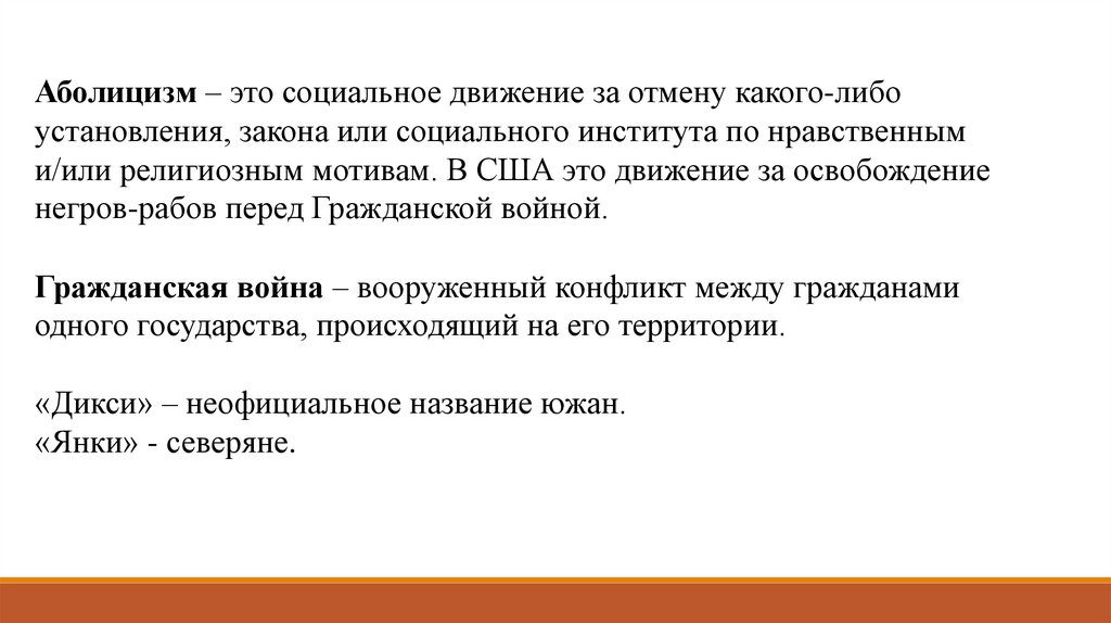 Аболицизм – это социальное движение за отмену какого-либоустановления, закона или социального института по нравственным