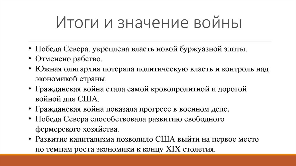 Итоги и значение войны• Победа Севера, укреплена власть новой буржуазной элиты.