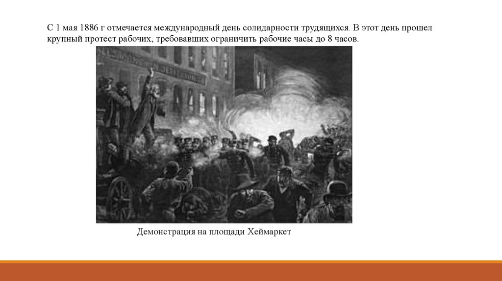 С 1 мая 1886 г отмечается международный день солидарности трудящихся. В этот день прошелкрупный протест рабочих, требовавших ограничить рабочие часы до 8 часов.