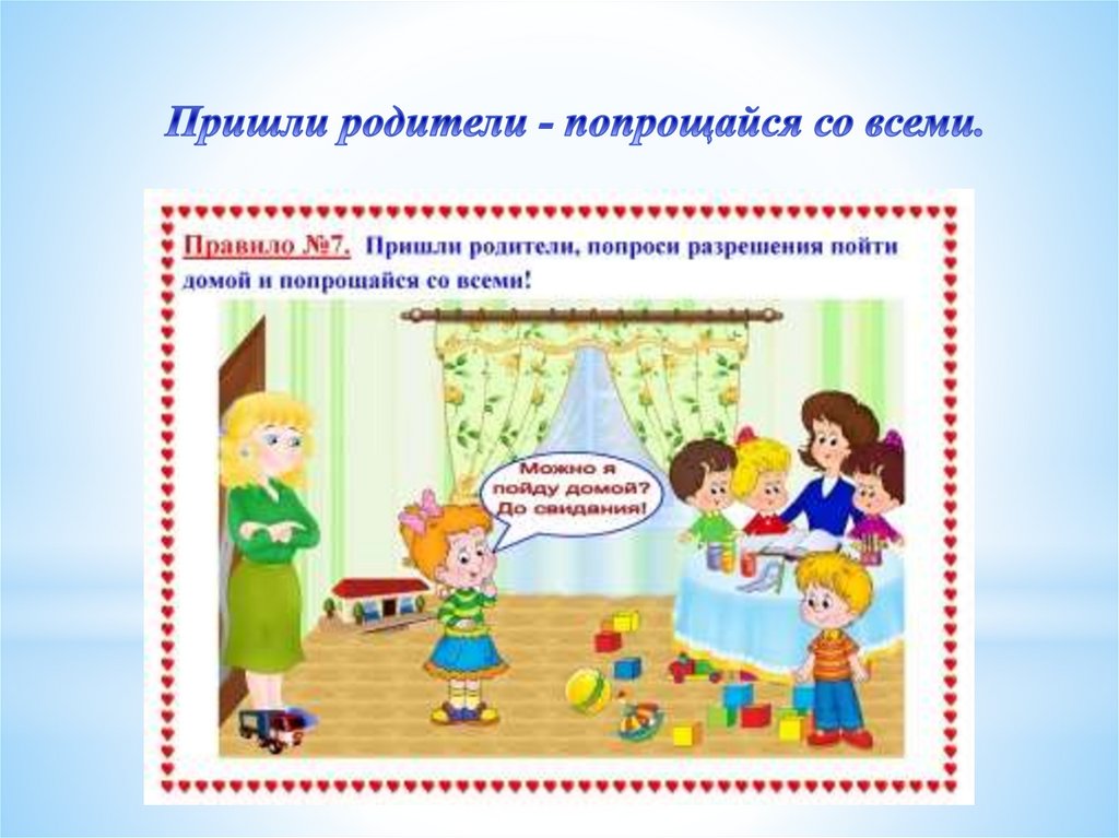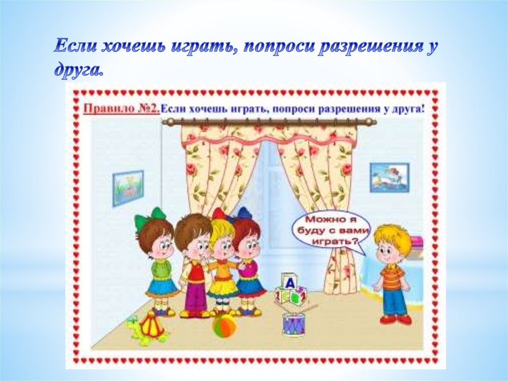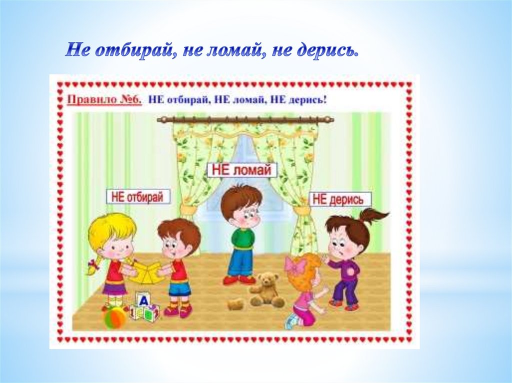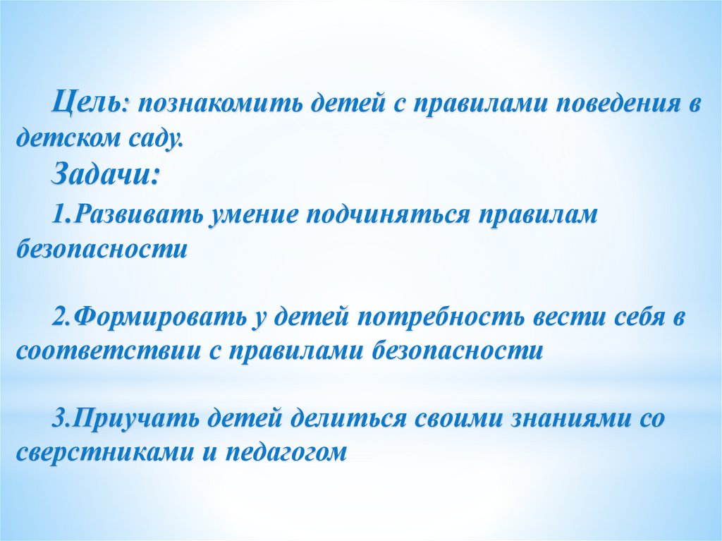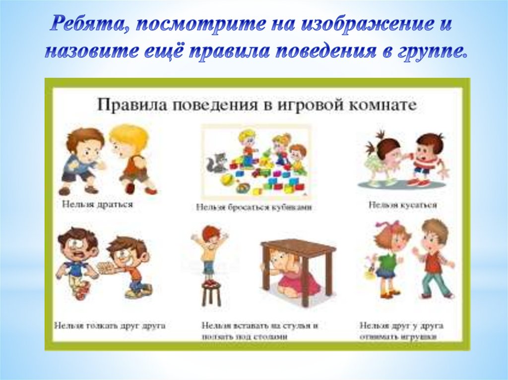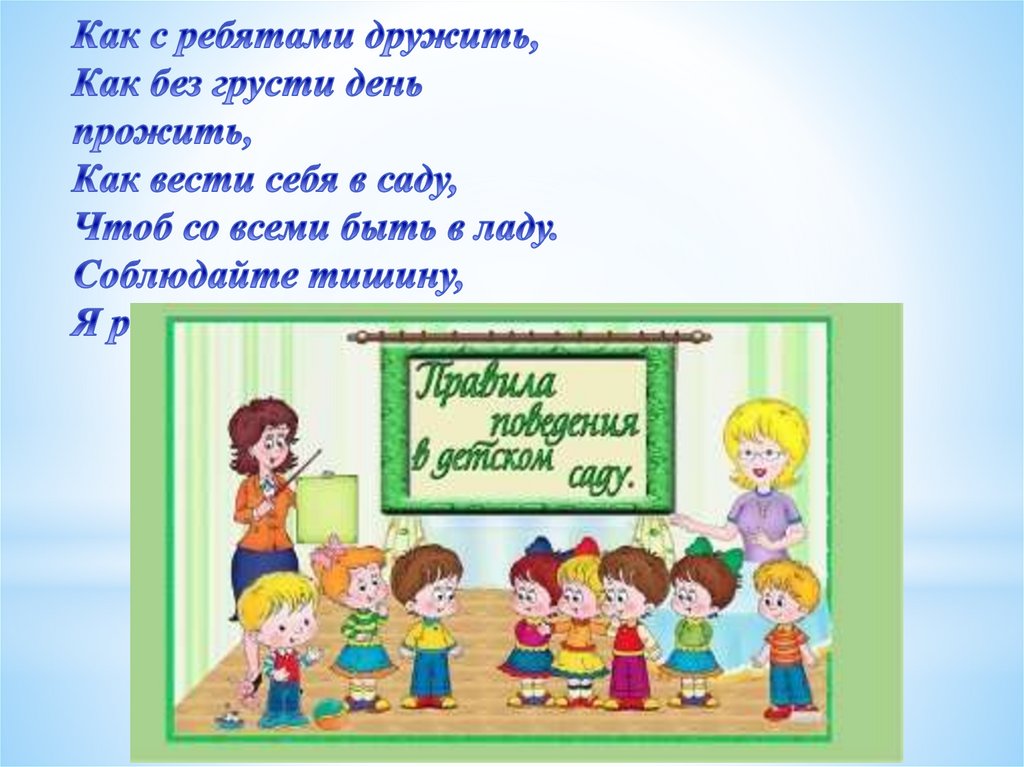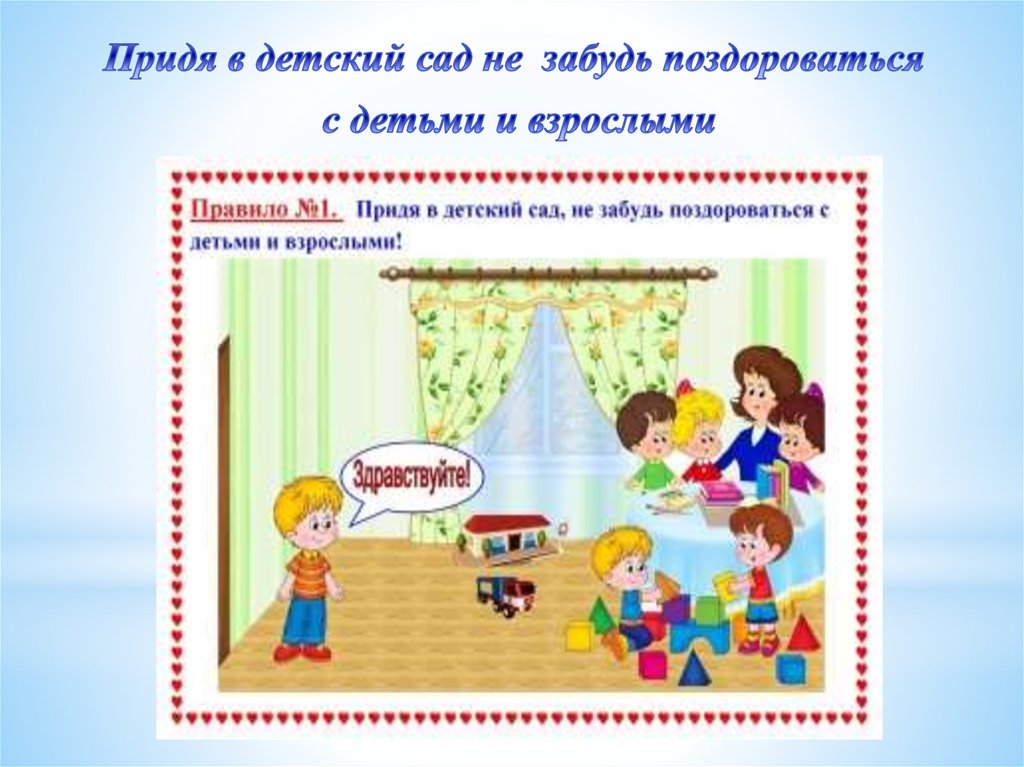 Цель: познакомить детей с правилами поведения вдетском саду.