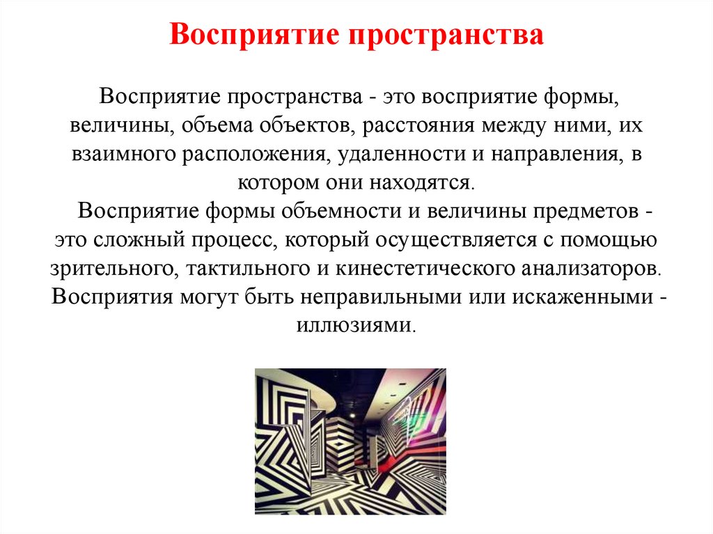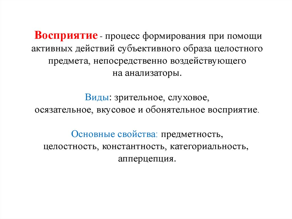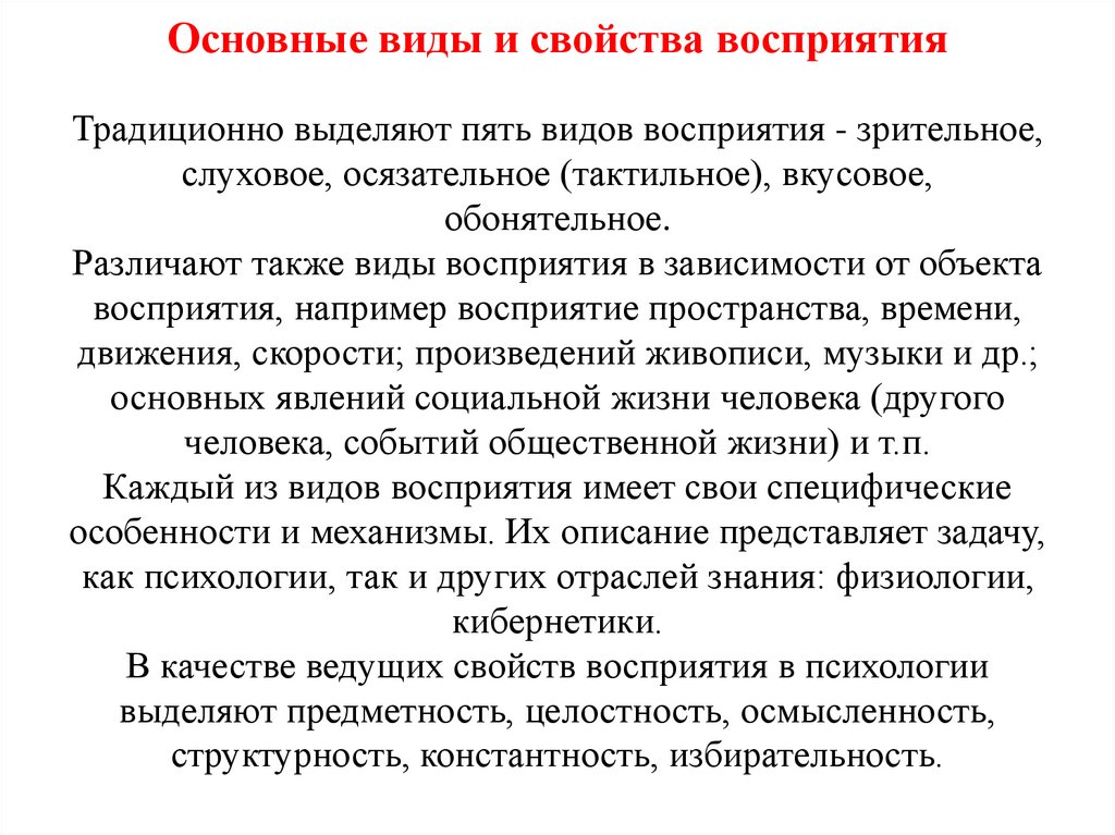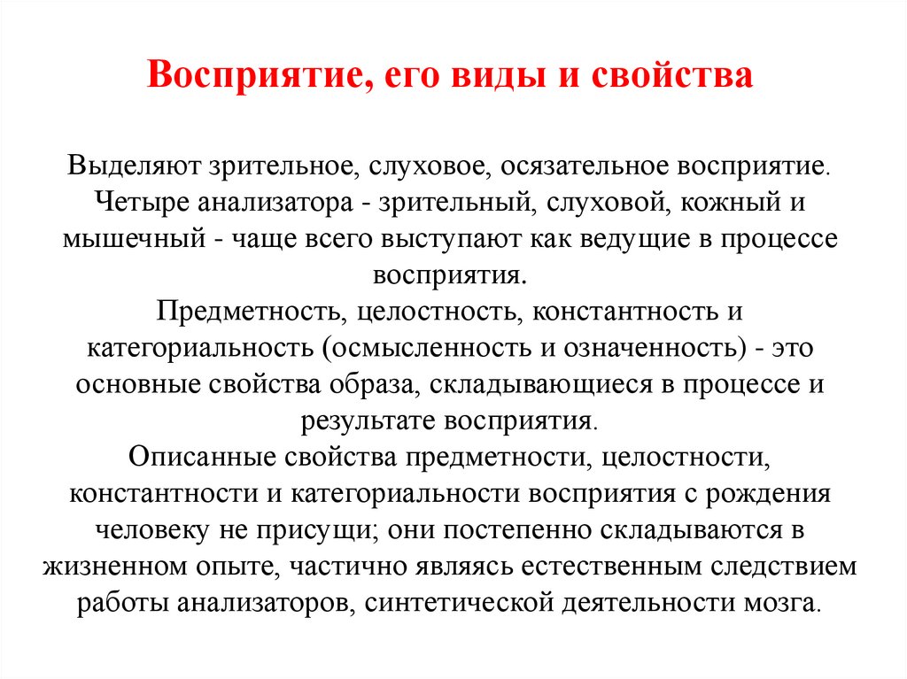 Восприятие, его виды и свойстваВыделяют зрительное, слуховое, осязательное восприятие.