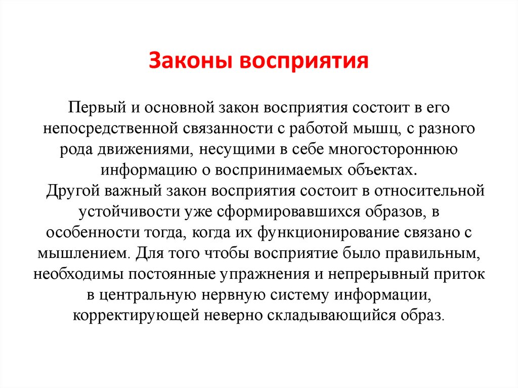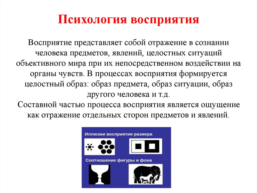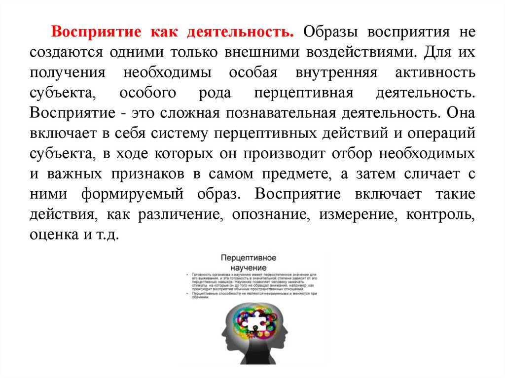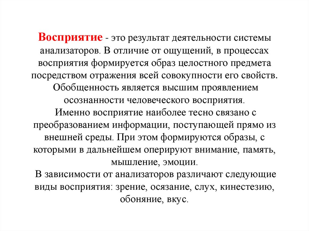 Восприятие - это результат деятельности системыанализаторов. В отличие от ощущений, в процессах
