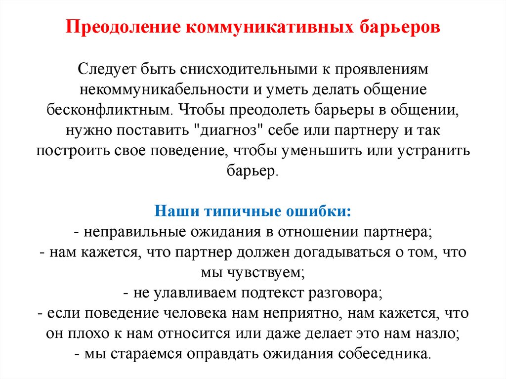 Преодоление коммуникативных барьеровСледует быть снисходительными к проявлениям