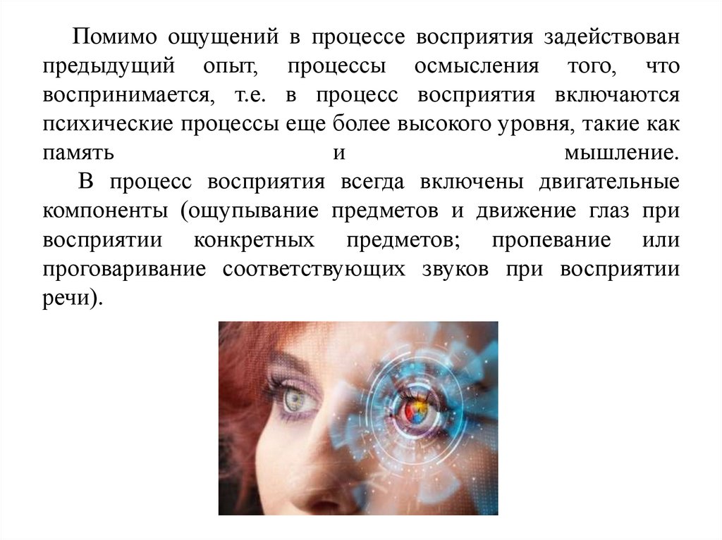 Помимо ощущений в процессе восприятия задействованпредыдущий опыт, процессы осмысления того, что