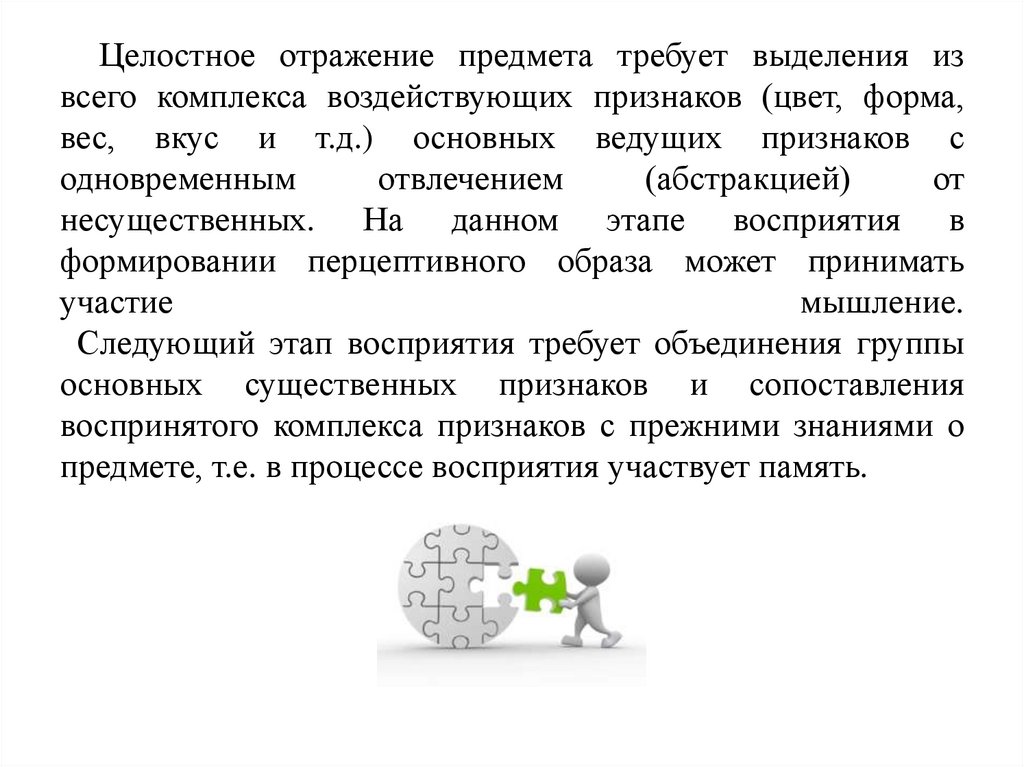 Целостное отражение предмета требует выделения извсего комплекса воздействующих признаков (цвет, форма,