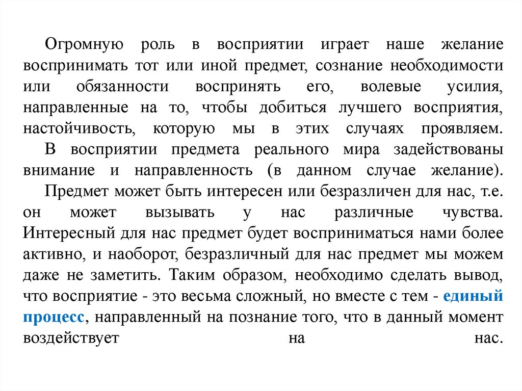 Огромную роль в восприятии играет наше желаниевоспринимать тот или иной предмет, сознание необходимости