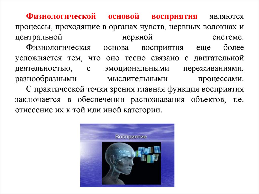 Физиологической основой восприятия являютсяпроцессы, проходящие в органах чувств, нервных волокнах и