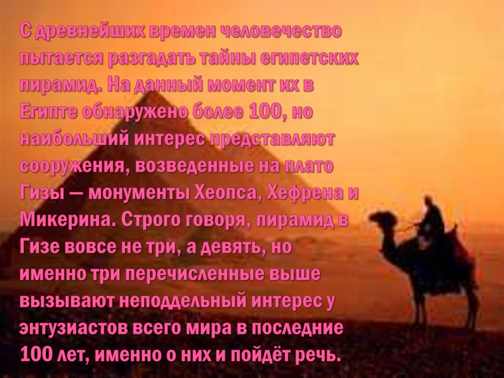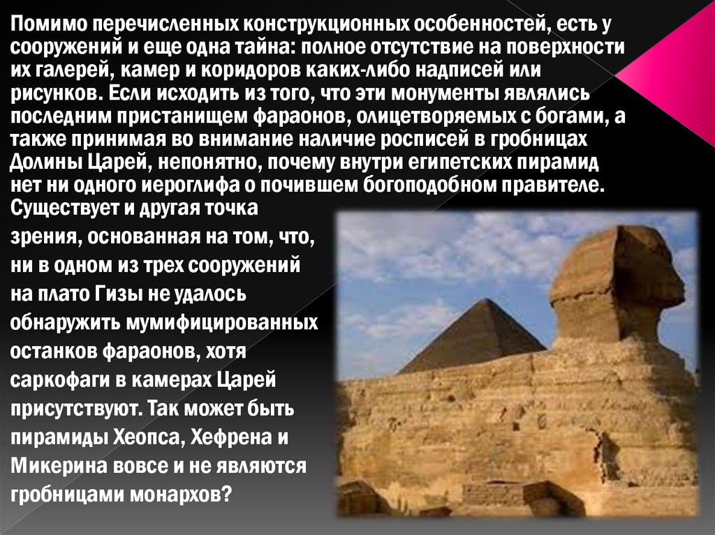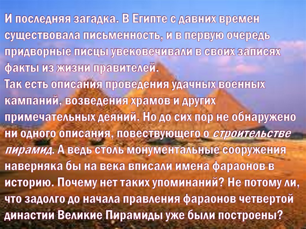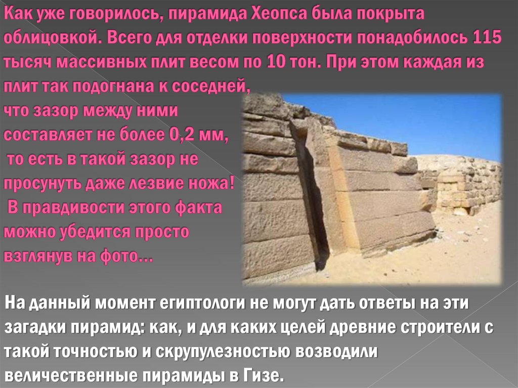 На данный момент египтологи не могут дать ответы на этизагадки пирамид: как, и для каких целей древние строители с