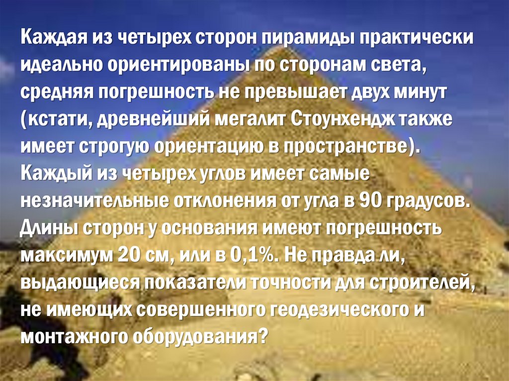 Каждая из четырех сторон пирамиды практическиидеально ориентированы по сторонам света,