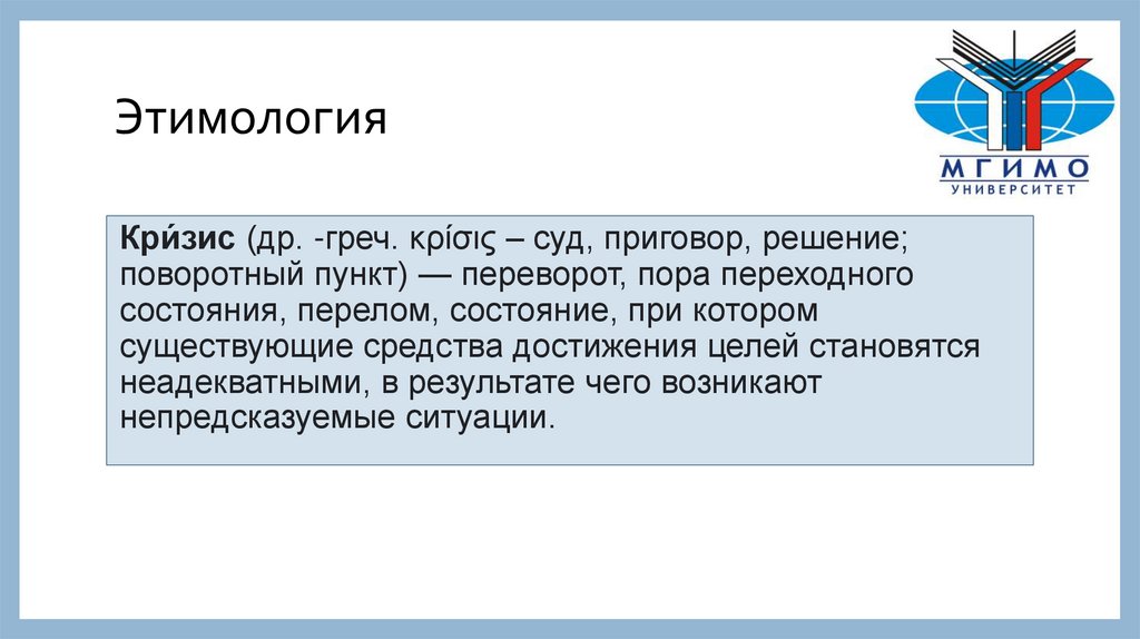 ЭтимологияКри́зис (др. -греч. κρίσις – суд, приговор, решение;