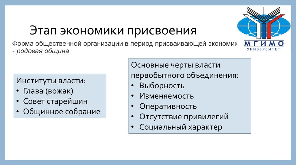 Этап экономики присвоенияФорма общественной организации в период присваивающей экономики