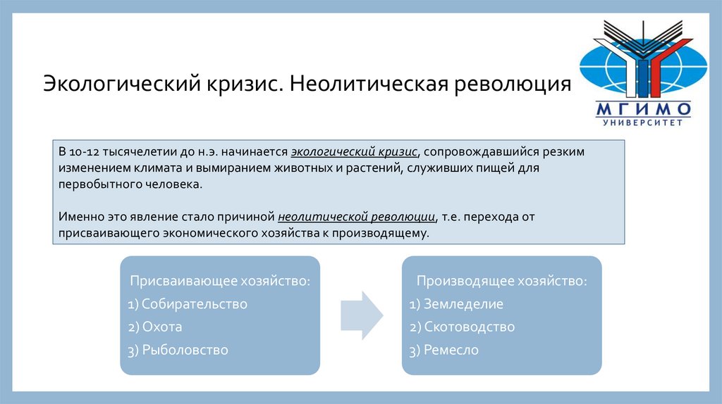Экологический кризис. Неолитическая революцияВ 10-12 тысячелетии до н.э. начинается экологический кризис, сопровождавшийся резким
