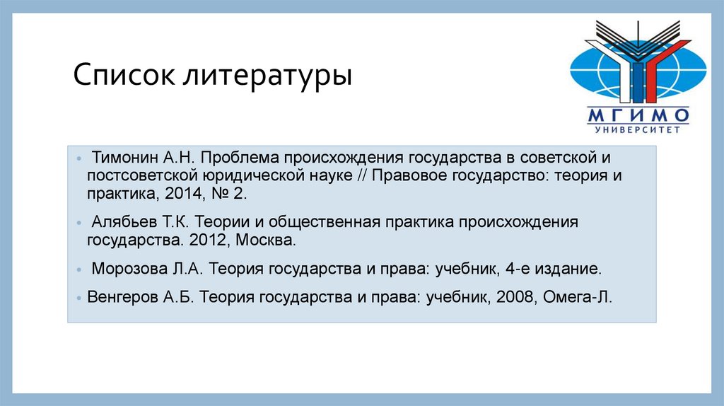 Список литературыТимонин А.Н. Проблема происхождения государства в советской и
