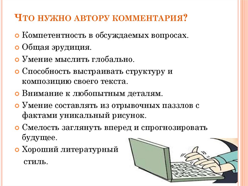 ЧТО НУЖНО АВТОРУ КОММЕНТАРИЯ?Компетентность в обсуждаемых вопросах.
