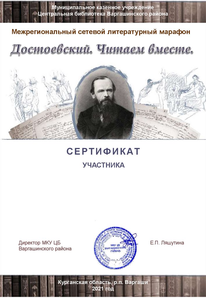 Центральная библиотека Варгашинского района. Межрегиональный сетевой литературный марафон. Сертификат участника