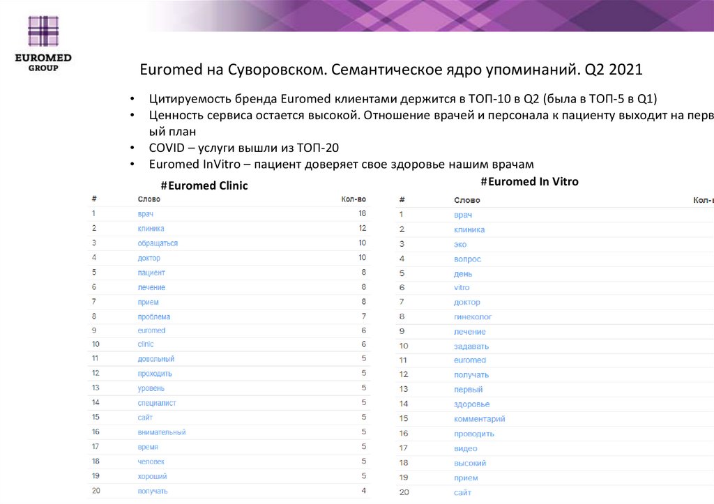 Euromed на Суворовском. Семантическое ядро упоминаний. Q2 2021Цитируемость бренда Euromed клиентами держится в ТОП-10 в Q2 (была в ТОП-5 в Q1)