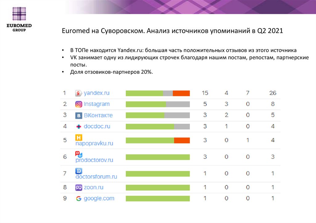 Euromed на Суворовском. Анализ источников упоминаний в Q2 2021В ТОПе находится Yandex.ru: большая часть положительных отзывов из этого источника