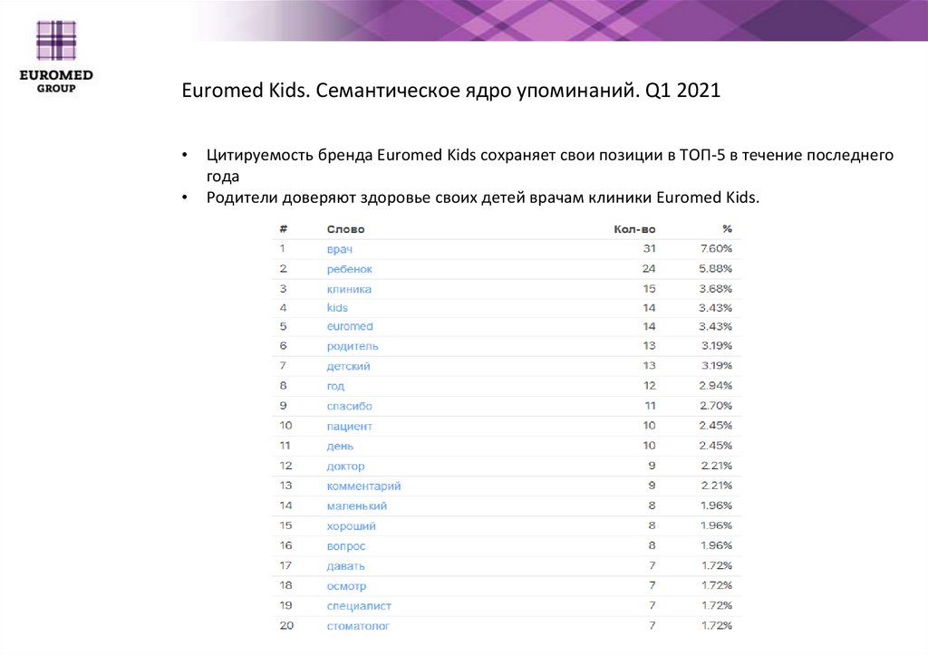 Euromed Kids. Семантическое ядро упоминаний. Q1 2021Цитируемость бренда Euromed Kids сохраняет свои позиции в ТОП-5 в течение последнего