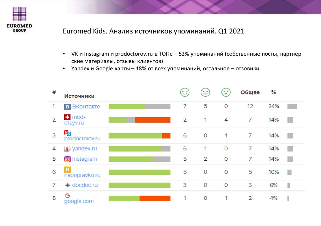 Euromed Kids. Анализ источников упоминаний. Q1 2021VK и Instagram и prodoctorov.ru в ТОПе – 52% упоминаний (собственные посты, партнер