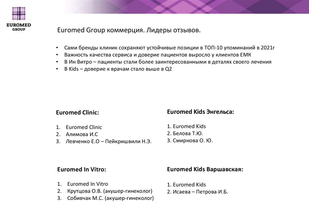 Euromed Group коммерция. Лидеры отзывов.Сами бренды клиник сохраняют устойчивые позиции в ТОП-10 упоминаний в 2021г