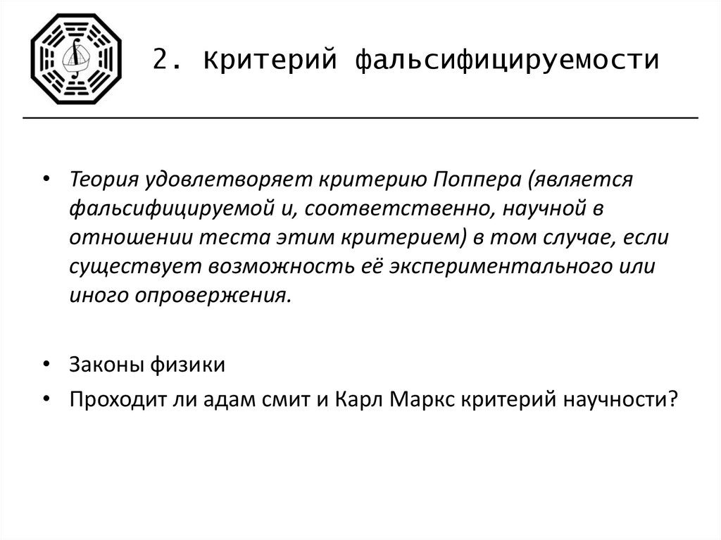2. Критерий фальсифицируемости• Теория удовлетворяет критерию Поппера (является