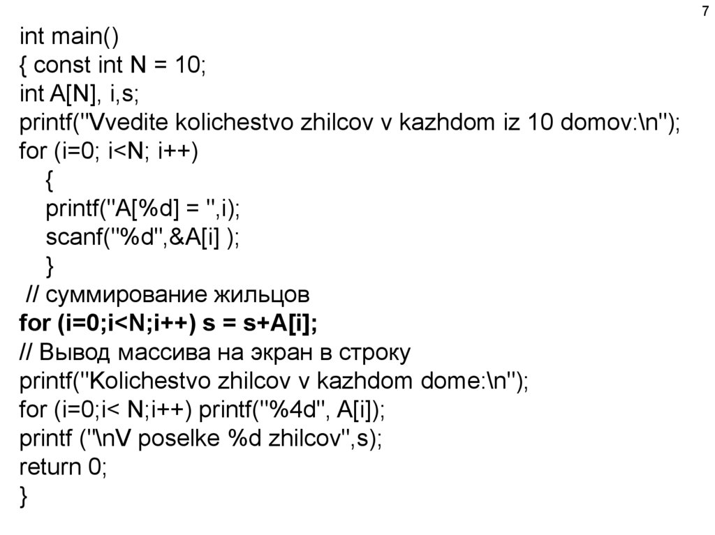 printf("Vvedite kolichestvo zhilcov v kazhdom iz 10 domov:\n");