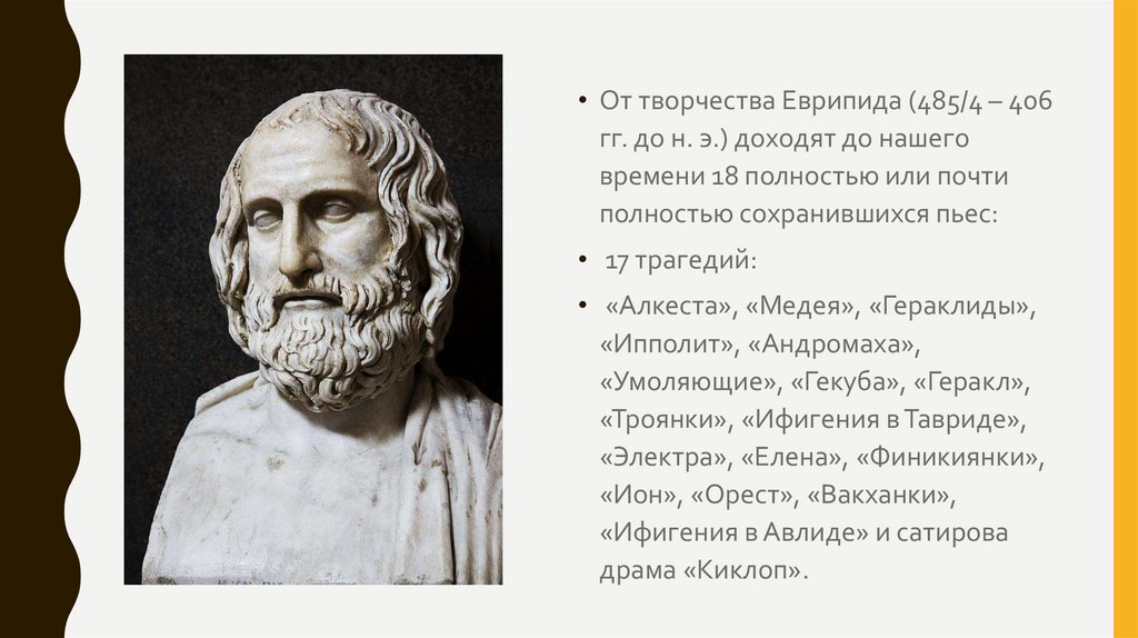 • От творчества Еврипида (485/4 – 406гг. до н. э.) доходят до нашего
