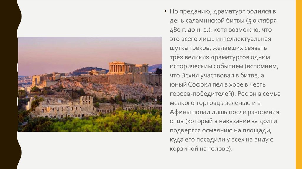 • По преданию, драматург родился вдень саламинской битвы (5 октября