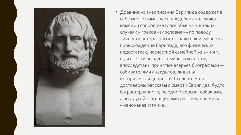 • Древние жизнеописания Еврипида содержат всебе много вымысла: враждебная полемика