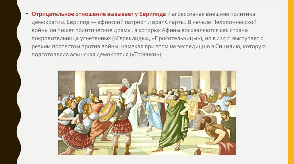 • Отрицательное отношение вызывает у Еврипида и агрессивная внешняя политикадемократии. Еврипид — афинский патриот и враг Спарты. В начале Пелопоннесской