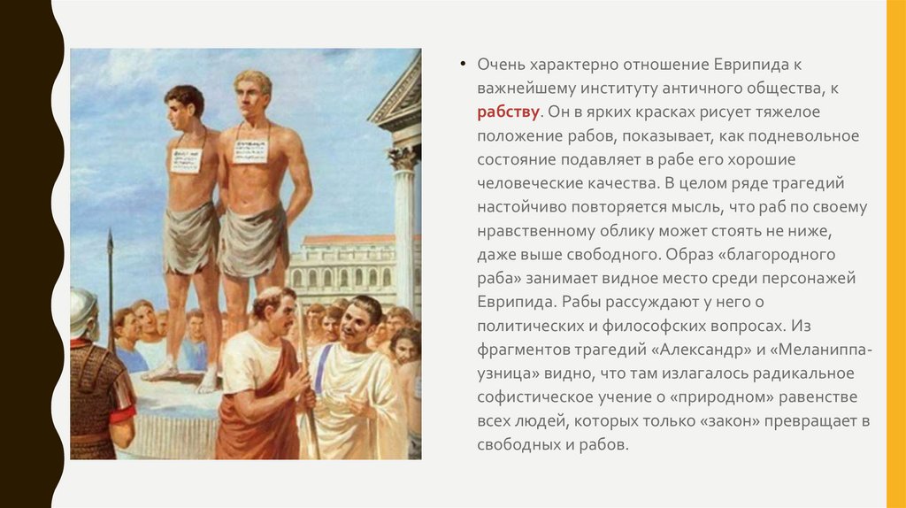 • Очень характерно отношение Еврипида кважнейшему институту античного общества, к